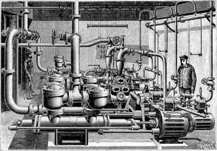 The Worthington tandem compound steam pumps used at the base of the Eiffel Tower’s south pier. These pumps supplied the water needed for the elevators used in the Tower. Worthington’s design was the only American foreign material used in the tower.